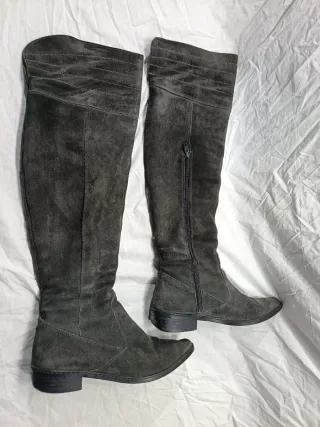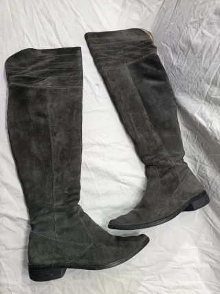 Botas altas de Ante en color Gris. -Longuitud 54cm + - . - Diseño mosquetero. - Cremallera lateral. - Detalle de costuras en la parte superior. Usadas pero aún les queda mucha vida las cremalleras les funcionan perfectamente.