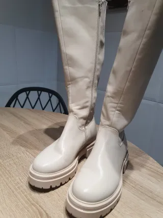 Botas altas de color beige, talla 40. Son de estilo militar con cordones y caña alta de punto. Ideales para el otoño. - Caña alta de punto acanalado. - Cordones funcionales. - Suela gruesa.