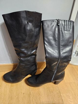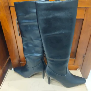 Botas altas por la rodilla o por encima, color negro talla 38, puestas en 4 ocasiones. Tacón 9,5 cm. Caña de la bota unos 49 cm desde el final del tacón hasta el final de la bota. Posibilidad de extenderla unos 11 cm más.