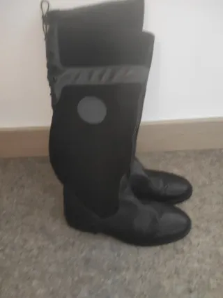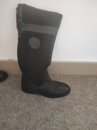 Botas altas de cuero para equitación. Se regala espuelas botas de goma vendas azul con estrella nueva y blancas nuevo a estrenar..casco usado y estribos ingles - Cierre con cremallera. - Detalle de cordones en la parte delantera. - Suela de goma.