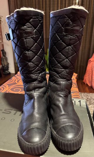 Botas altas de la marca G-Star Raw en color negro. Presentan un diseño acolchado y forro interior de pelo sintético para mayor calidez. - Parte superior acolchada con diseño de rombos. - Detalle de etiqueta de la marca en la caña. - Forro interior de pelo sintético blanco. - Cierre lateral con hebilla. - Suela de goma. Dan talla. Caja original.
