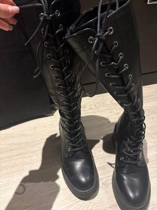 Botas altas de la marca ZARA en color negro y talla 36. Son de estilo militar con cordones. Están en buen estado, con algunas señales normales de uso. - Material: Piel sintética - Cierre: Cremallera lateral y cordones - Tacón: Plano (Están como nuevas. Me las han regalado, [ya usadas] pero no me quedan)