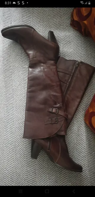 Botas altas de cuero en tono marrón. Un clásico que combina con todo. - Material exterior de cuero. - Tacón grueso y cómodo. - Cremallera lateral para facilitar el acceso. - Totalmente nuevas