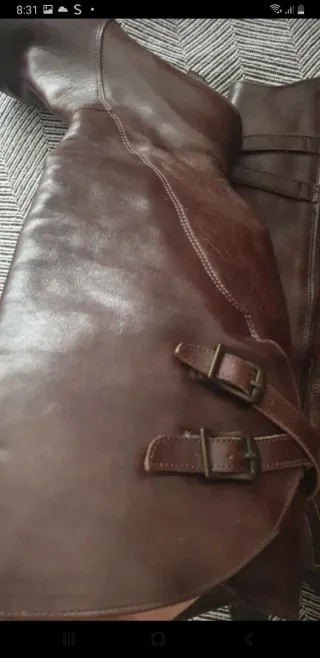 Botas altas de cuero en color marrón. - Diseño elegante con hebillas decorativas. - Cierre de cremallera lateral. - Tacón grueso para mayor comodidad.