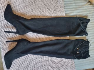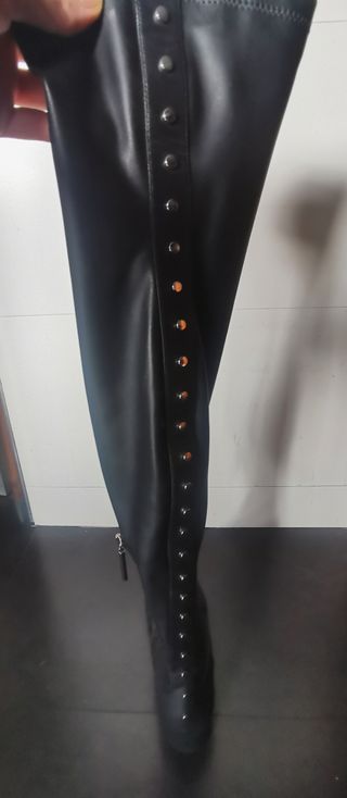 Botas Zara polipiel por encima de la rodilla. Caña ancha y tacón bajo (unos 2-3 cm). Cremallera en la parte interna y remaches metálicos en toda la parte posterior central de la pierna. Número 37, prácticamente sin uso.