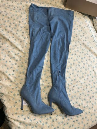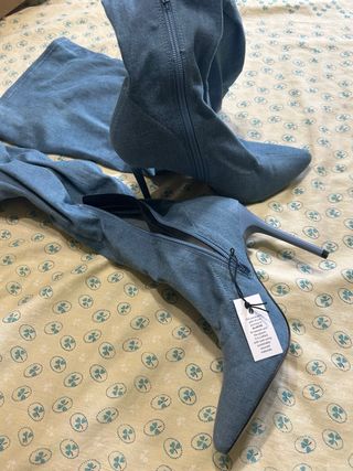 Botas altas de estilo vaquero, perfectas para completar tu look. - Diseño de caña alta. - Acabado en tejido vaquero. - Tacón de aguja. 84 cm desde el tacón