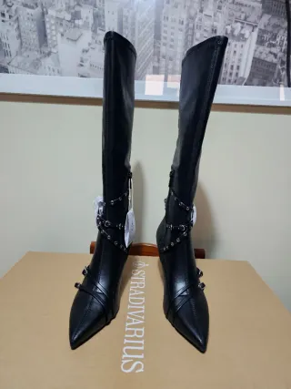 Botas altas de la marca Zara en color negro. Presentan un diseño moderno con detalles de tiras. - Tiras decorativas con hebillas. - Cierre lateral. - Suela gruesa.