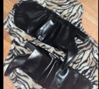 Elegantes botas altas negras con un diseño moderno. - Tacón alto y plataforma. - Detalle de hebilla dorada en el tobillo. - Material elástico en la parte superior de la caña. - Cierre de cremallera lateral. -Solo le di un uso asi que estan como nuevas