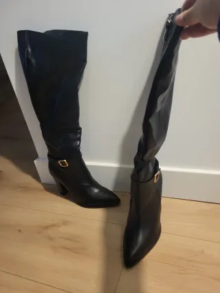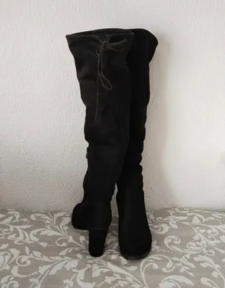 Botas altas de color negro. - Material exterior de ante. - Diseño de caña alta. El largo mide unos 23cm de largo, hasta la rodilla En persona se aprecia mejor.