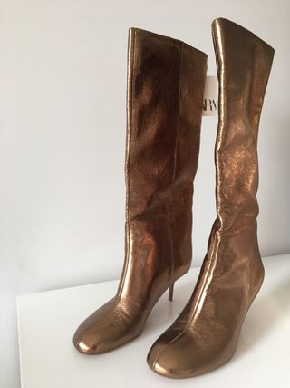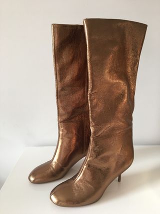 Botas altas de color ocre con acabado metálico, completamente nuevas. Botas de caña alta en tono ocre . Caña 40 cm alto desde el tacón Tacón fino 5 cm alto