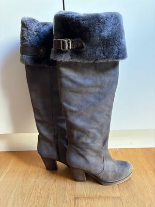Botas altas de ante de color morado marca Mimao. Son el 41 pero tallan pequeñas (yo tengo el 39, para un 40 valdrían también porque yo tengo el pie ancho y me gusta mover los dedos). Son comodísimas. Me las compré a principios de año y me las he puesto 1 vez. En la pàgina cuestan 139€. Altura del tacón: 6,5 cm Material exterior: Piel de serraje y lycra Tecnología del confort: Plantilla de Piel Ultra Confort Gel Cierre de cremallera lateral Puntera: fina Altura de la caña: 40 cm Diámetro de la caña: 35 cm Suela: Goma antideslizante y ultra flexible
