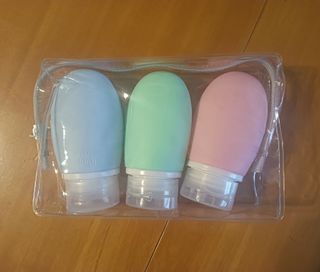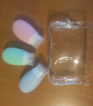 Set de tres botes de silicona reutilizables, perfectos para llevar tus líquidos de viaje o al gimnasio.Son nuevos y vienen en un práctico neceser transparente.capacidad 60 ml.Colores pastel verde agua/azul cielo/rosa bebe.(No hago envíos vendo en mano).