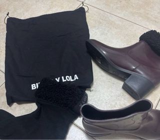 Botas ideales para esta época de lluvia!!! Divinas Botas de agua con un acabado brillante y un diseño moderno. - Color burdeos. - Tacón cuadrado y cómodo. - Caña corta. - Calcetines de borreguito con logo de BIMBA Y LOLA de quita y pon. Muy poco uso. La talla pone M. Equivale a un 37.
