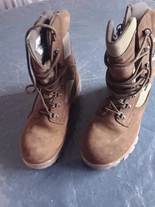 Botas de montaña/militares marca Bestard, modelo Desert Adventure en color beige/verde oliva. Perfectas para montañismo, actividades militares o actividades de caza. Se ve algún enganche oxidado por haberse usado sólo una vez, pisando agua. No están cedidas (ensanchadas por el uso) en el interior. - Cierre con cordones. - Suela de goma. - Caña alta para mayor sujeción. Se pueden probar en zona Zaragoza, Huesca o alrededores. Precio negociable si la oferta es seria.