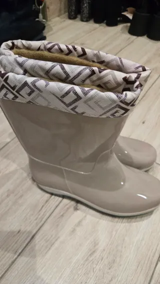 Botas de agua de color beige con un diseño moderno y práctico. - Forro interior de pelo para mayor calidez. - Detalle de estampado geométrico en el borde superior.