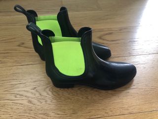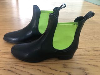 Botas de agua, de goma, negras. Forradas. - Diseño corto y moderno. - Tirador en la parte trasera para facilitar su colocación. - Suela de goma antideslizante. - se han puesto 3 veces, prácticamente nuevas.