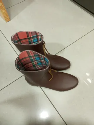 Botas de agua con un diseño moderno y cómodo. Tiene una altura perfecta para que no entre nada de agua. Sirven para talla 39-40. - Forro interior a cuadros en tonos rojos y azules. - Material exterior resistente.