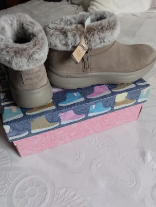 Botas de la marca Skechers, modelo Keepsakes Cozy. Tipo ugg. Talla 38 color negro. Solo una puesta, estan nuevas y con caja. Diseñado con sistema Heel Pillow™, este botín casual sin cordones cuenta con una parte superior de ante con tratamiento 3M® Scotchgard® (repele el agua), un forro completo de lana afelpada y una plantilla Warm Tech Memory Foam con amortiguación concebida para conservar tu calor corporal.