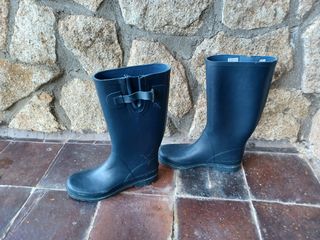 Botas de agua de goma con forro interior. Usadas solo una vez. Tengo dos pares. - Caña alta. - Suela antideslizante. - Detalle de ribete azul en la caña.