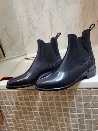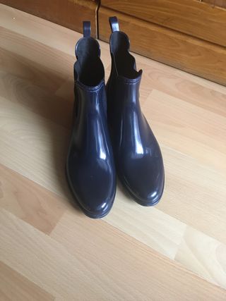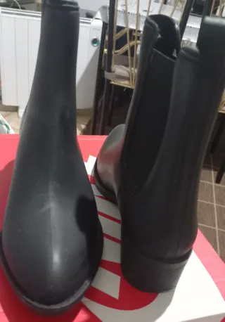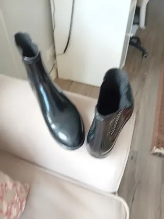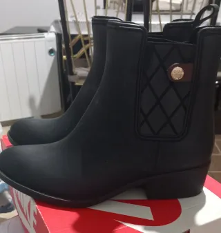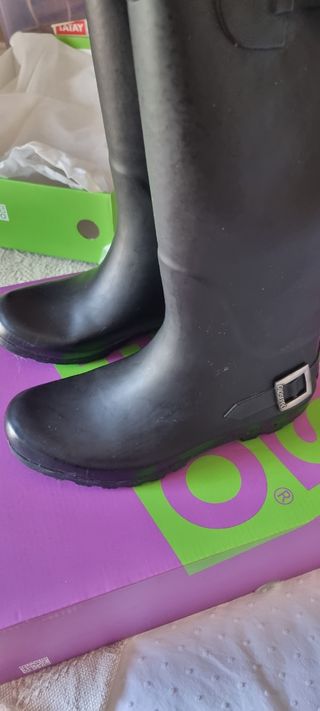 Usado unas ocho veces. Las vendo por no ponérmelas. La suela se ve poco uso. Su talla es un 39 pero en botas de agua (katiuskas) son normalmente anchas y de largo tallan bien. Es recomendable ponerse encima del calcetín normal un calcetín grueso y así te sujeta mejor la bota y llevas el pie más calentito. Es una marca que da muy buenos resultados (he tenido otros modelos y muy buen resultados). Combina con muchos vaqueros y es original.