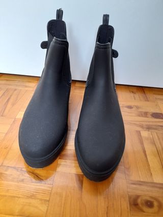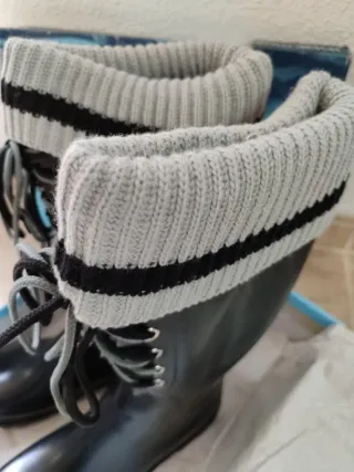 Botas de agua negras con un diseño moderno y cómodo. Usadas una vez. Son calientes y goma muy buena de agarre al pavimento. - Incluyen calcetines de punto grises con detalles en negro. - Cierre de cordones. - Material de goma.