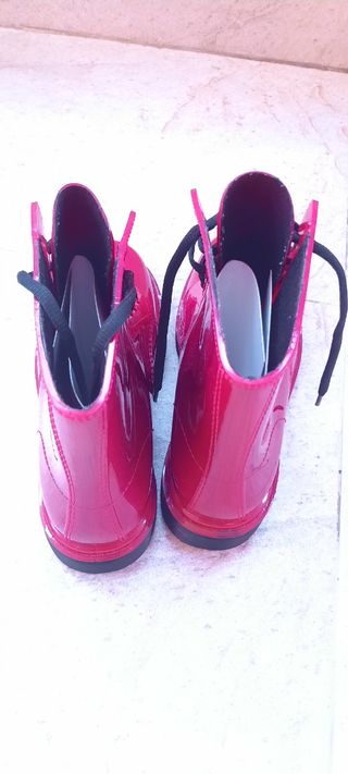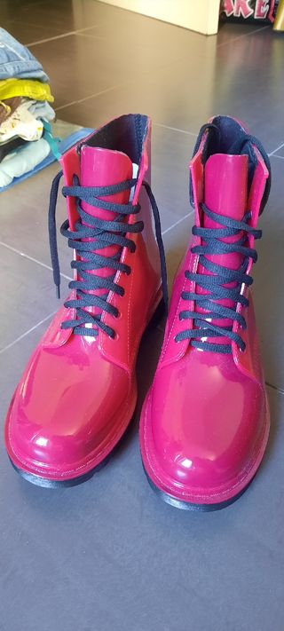 Botas de agua color rojo intenso, talla 40. Diseño tipo 'combat boots' con cordones negros. Nuevas a estrenar