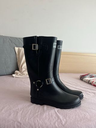 Botas de agua Mustang, ideales para días lluviosos. Son un par de botas altas, de color negro y con hebillas. - Diseño elegante y práctico. - Perfectas para mantener los pies secos y protegidos. Se encuentran en muy buen estado