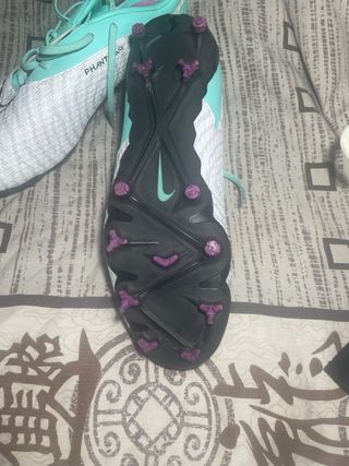 Botas de fútbol Nike Phantom GT en color verde agua y blanco. Diseñadas para ofrecer un buen agarre y control en el campo. - Parte superior texturizada para un mejor toque de balón. - Cierre de cordones. - Suela con tacos para césped natural o artificial.