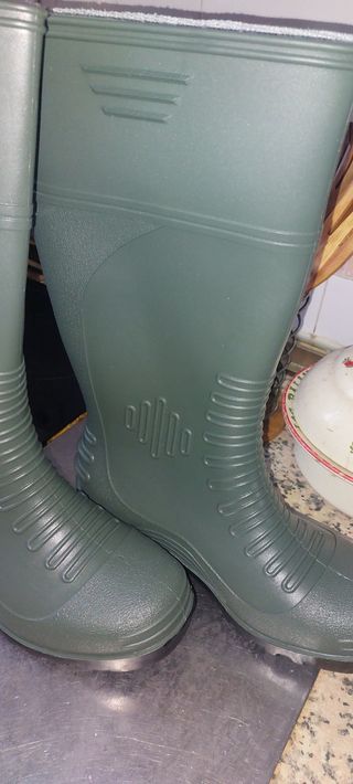 Se venden 2 pares de botas de agua. Uno de los pares de botas la punta es metálica de color verde y el otro par de botas normal de color verde oliva. Están en buen estado. El precio de cada una es de 20€ si te llevas los dos pares se quedarían en 35€ - Ideales para días lluviosos. - Fabricadas con material resistente. - Cómodas y prácticas.