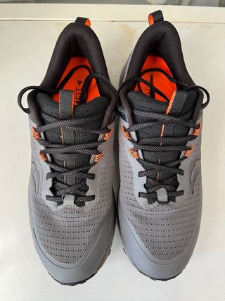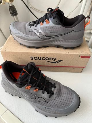 Zapatillas de Trail. Marca Saucony. Modelo Peregrine 13 GTX (Tecnología GORETEX repelente al agua). Color gris y tonos naranjas. Talla 44 EU. Se vende con caja original. Apenas puestas dos veces. Las cambio porque me han regalado otras que se adaptan más a mis necesidades, pero son un zapatillón.