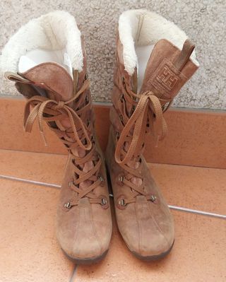Botas de agua o nieve con forro interior. - Parte superior de cuero. - Suela de goma. - Cordones amarillos y marrones.