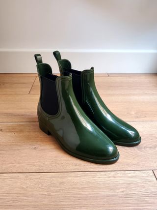 Botas de agua de estilo Chelsea en color verde. Diseño brillante, con tirador trasero para facilitar su colocación y suela de goma.