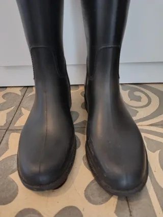 Botas de agua, de goma, negras. Forradas. - Diseño corto y moderno. - Tirador en la parte trasera para facilitar su colocación. - Suela de goma antideslizante. - se han puesto 3 veces, prácticamente nuevas.
