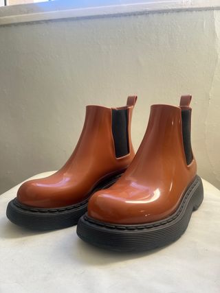 Botas de estilo Chelsea de la marca Melissa en color marrón. - Diseño moderno con suela gruesa. - Material sintético brillante. - Paneles elásticos laterales. Las vendo sólo porque me quedaron grandes, tienen un par de usos y se encuentran en perfecto estado. El color es más terracota que marrón, son muy cómodas y resistentes al agua. Precio de referencia (nuevas): 128€ Son 100% veganas y reciclables :)