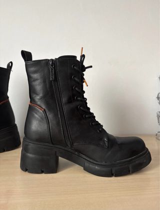 Botas de estilo militar en color negro. Son impermeables y cuentan con un diseño moderno. - Cierre de cordones. - Suela gruesa y resistente. - Detalle de cremallera lateral. - Puntera reforzada.