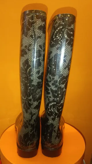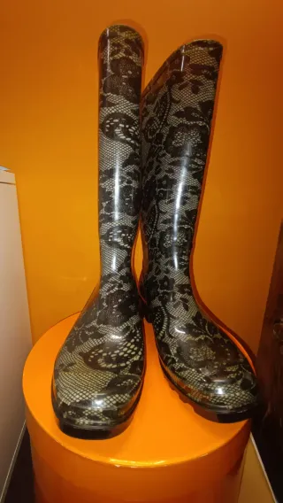 Botas de agua altas con un diseño de encaje muy original. - Estampado de encaje en negro y multicolor. - Talla 39.