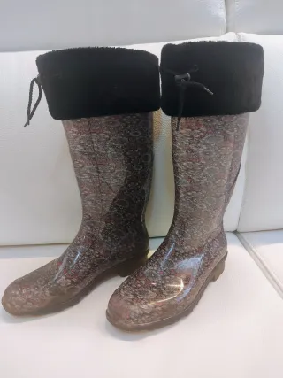 Botas de agua número 40. Estampado de flores en colores rojo y gris con decoración de peluche negro en la parte superior. Buen estado.