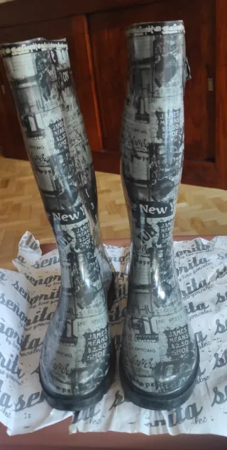Botas de agua para señora con un diseño original estampado como si fueran páginas de periódico. Son altas y perfectas para días de lluvia. - Estampado de periódico en blanco y negro. - Diseño alto hasta la rodilla.