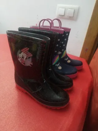 Preciosas botas de agua para niños. - Diseño de unicornio con estrellas. - Modelo liso en color negro minie - Suela de goma. Las de unicornio se han usado pero están en buen estado número 33/34 Las de minie está. Nuevas n 35 6€ las dos