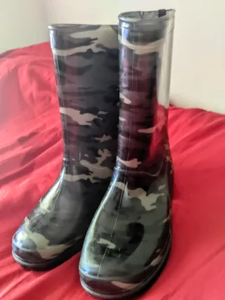 Botas de agua para niño con un divertido estampado de camuflaje. Perfecto para días lluviosos, no pasa el agua nunca. ¡TALLA 33/34 NO 35 como pone ahí, solo que no deja poner menos de 35! - Talla 33/34. - Diseño en negro y verde. - Marca Primark.
