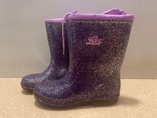 Botas de agua para niños con un diseño brillante y divertido. - Color morado con detalles plateados. - Forro interior morado. - Cordón ajustable en la parte superior.