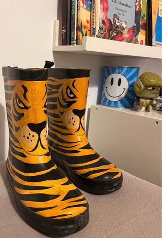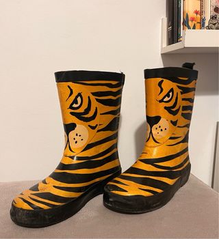 Divertidas botas de agua para niños con un llamativo diseño de tigre. Talla 31 para niños/as - Dibujo de tigre completo en ambas botas. - Tiras negras en la parte superior.