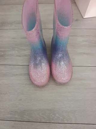 Botas de agua con un diseño degradado de colores, perfectas para días lluviosos. TALLA 31 - Acabado brillante con purpurina. - Diseño degradado de rosa a morado.