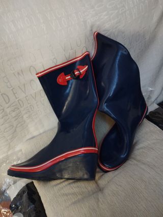 Botas de agua de cuña, ideales para días lluviosos. Son de color azul marino con detalles en rojo. - Diseño de cuña. - Acabado brillante. - Cierre de hebilla.