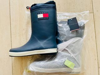 Botas de agua Tommy Hilfiger en color Azul Marino. Perfectas para días lluviosos. - Diseño clásico y elegante. - Banda elástica lateral para facilitar su puesta. - Tirador trasero. - Detalle de rayas rojas, blancas y azules en la parte superior. Sin Estrenar. Fueron un regalo que tire la caja y ya no me cambiaron.