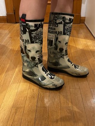 Botas de agua con un diseño original y llamativo. - Estampado de collage con imágenes y texto imitando un periódico. - Caña alta. - Suela de goma. Se han usado solo una vez.