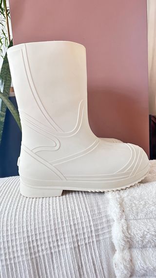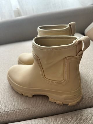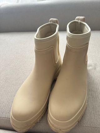 Botas de agua de Zara en color beige. Son de caña corta y estilo casual. Ideales para días lluviosos. - Material ligero y cómodo. - Suela resistente.