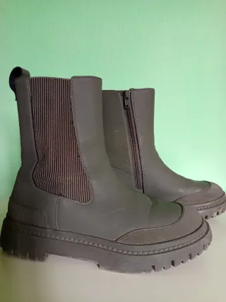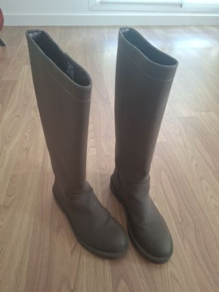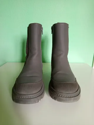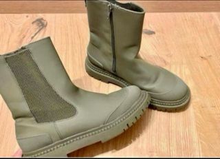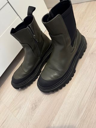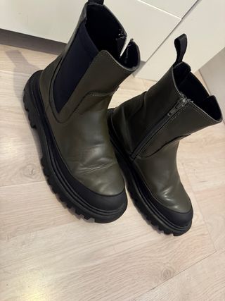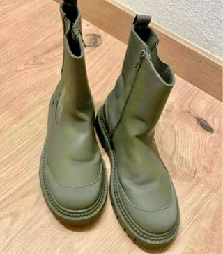 Botas de agua Zara, talla 36, color verde oliva. Son de estilo casual y tienen un diseño elegante. - Material: parecen de imitación de piel. - Suela: gruesa y resistente. - Cierre: cremallera lateral.
