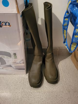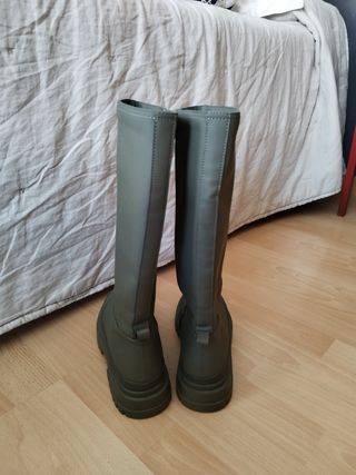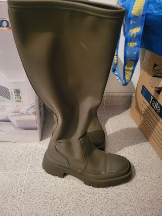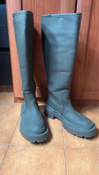 Botas de agua altas de Zara en color verde oliva. Perfectas para días lluviosos. - Diseño alto hasta la rodilla. - Suela gruesa y resistente. - Acabado liso.