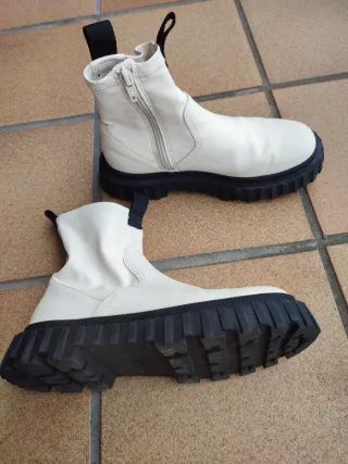 Botas altas forradas de borrego 🐑, perfectas para el frío. Son de piel genuina. Se puede dar la vuelta y que se vea el borreguillo. Costaron 139.95€ el invierno pasado. Están sin etiqueta y sin usar. - Material exterior con textura. - Suela gruesa y resistente. Tipo track - Cierre lateral. - Puntera reforzada resistente al agua